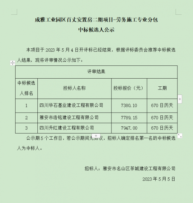 成雅工業(yè)園區(qū)百丈安置房二期項(xiàng)目-勞務(wù)施工專(zhuān)業(yè)分包中標(biāo)候選人公示
